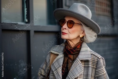 Elegant Senior Woman in Stylish Autumn Attire. Portrait of a sophisticated senior woman wearing sunglasses, with a classic plaid coat on an urban backdrop.