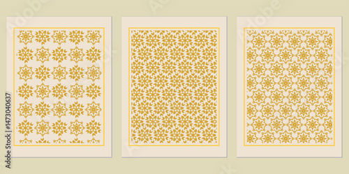 Elegant series of framed golden floral pattern prints, a harmonious blend of traditional design elements with a modern aesthetic, ideal for art decor
