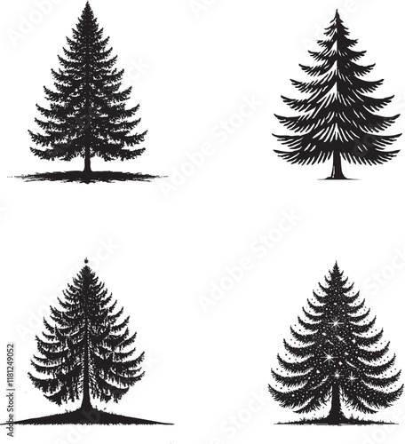 "Elegant Silhouettes of the Fir Tree Isolated on a White Background in Monochrome Art Style"