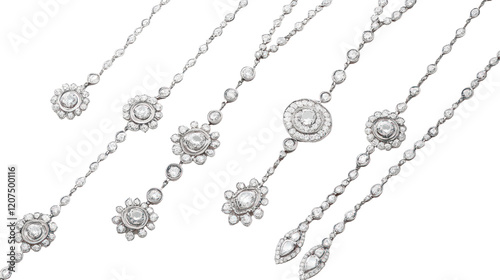 Elegant silver jewelry chains displayed on a white isolated background, showcasing intricate designs and patterns for fashion enthusiasts.