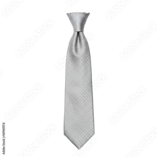 Elegant silver necktie with intricate diamond pattern and textured knot, isolated on white background