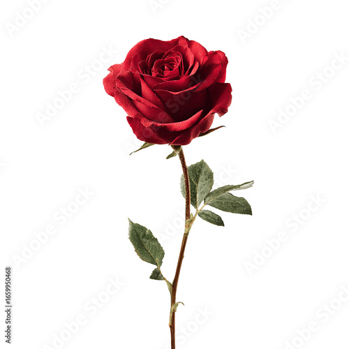 Elegant single red rose with green leaves on a white background, symbolizing love and beauty.