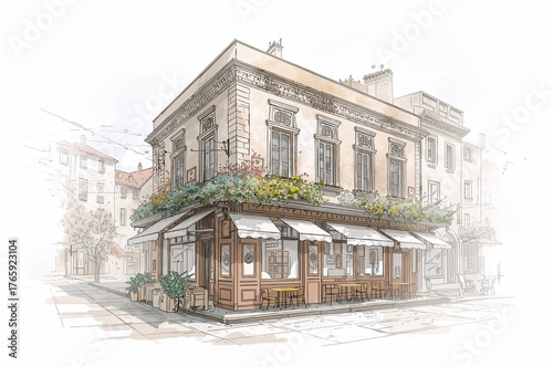 Elegant Sketch: Vintage European Cafe Illustration with Watercolor Shading