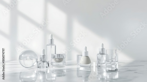Elegant skincare product display showcases clean beauty and minimalist design with bright, airy light for a modern, refreshing feel, perfect for beauty campaigns