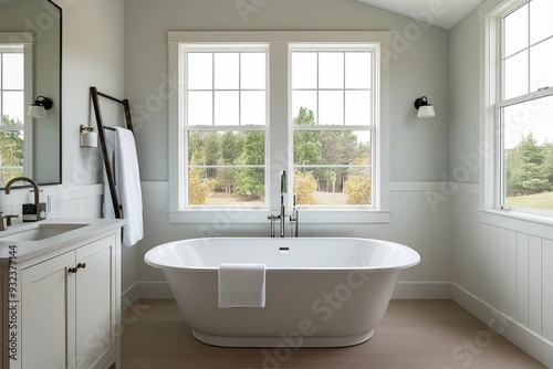 Elegant Soaking Tub in a Soft White Contemporary Bathroom Sanctuary