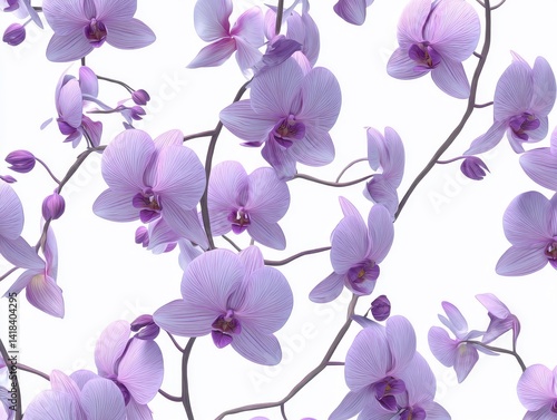 Elegant soft purple orchids blossoms gracefully intertwine, creating a tranquil scene of natural beauty and delicate floral design.