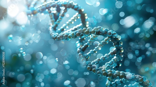Elegant spiral of rainbow DNA double helix with light bokeh and bubbles, creating a serene blue scene