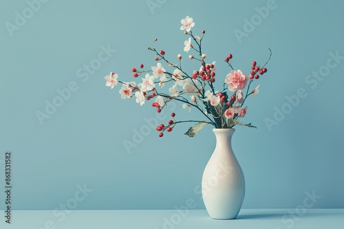 Elegant spring flowers in a vase against a blue background. Concept of minimalist decor, floristry, spring, nature and beauty.