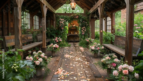 Elegant spring wedding ceremony surrounded by lush green plants and floral decor