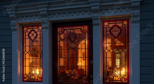 Elegant Stained Glass Entrance Featuring Ornate Victorian Design at Twilight