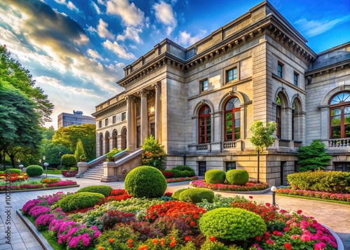 Elegant stone façade of a prestigious museum surrounded by lush greenery and vibrant flowers in a bustling downtown cultural district.