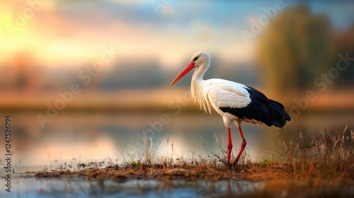 Elegant stork standing serenely by peaceful lakeside at sunset