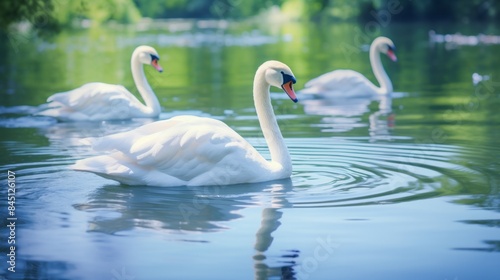 Elegant swans gracefully gliding across a calm lake, reflections in the water, a serene atmosphere.”