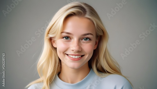 Elegant Swedish girl with flowing blonde hair and kind expression standing against a simple backdrop