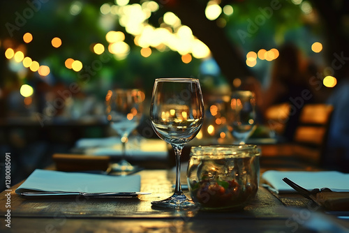 Elegant Table Setting at Twilight, A Wine Glass and Appetizer Delight