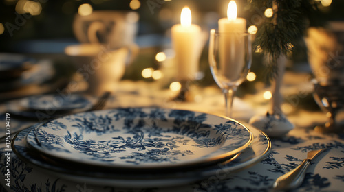 Elegant Table Setting in restaurant with Toile de Jouy - Perfect for Fine Dining, Wedding Decor, and Lifestyle Editorials