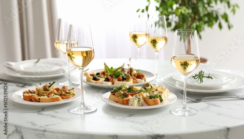 Elegant table setting with appetizers and white wine glasses, ready for a meal.