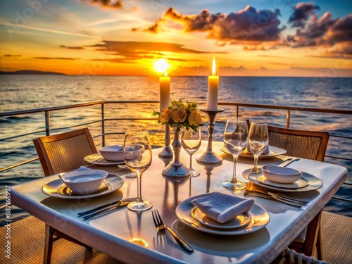 Elegant table setting with fine china, glasses, and candles on yacht deck at sunset, surrounded by serene ocean waters and distant horizon.