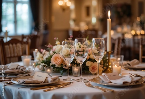 Elegant Table Setting with Floral Centerpiece and Wine Glasses