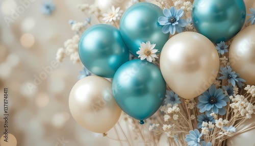 Elegant Teal and Cream Balloons with Flowers, Beautiful pastel balloons and flowers for celebration