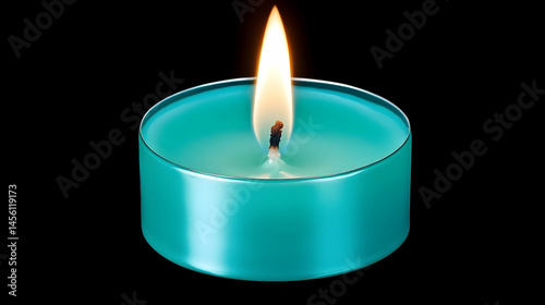 Elegant teal candle glowing brightly against a stark black backdrop in a studio setting