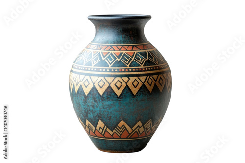 Elegant teal ceramic vase with intricate Native American inspired geometric patterns against a black