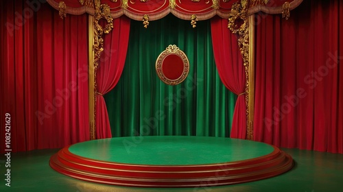 Elegant Theatrical Stage Set with Red and Green Drapes, Intricate Golden Accents, and Central Decorative Frame Ideal for Performances and Events