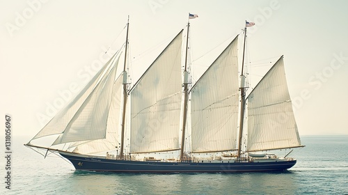 Elegant Three-Masted Sailing Ship Gliding Over Calming Ocean Waters Under Clear Sky