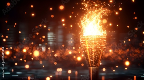 Elegant torch lighting a modern cityscape, symbolizing customer satisfaction as a bright force for growth, surrounded by warm, ethereal light--style raw