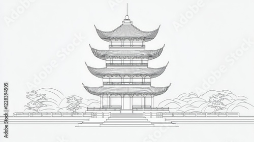 Elegant Traditional Pagoda Structure with Surrounding Landscape Design