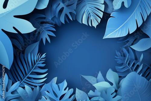 Elegant tropical leaf frame in layered paper-cut style on deep blue background. Perfect for summer ads, nature designs, and creative templates.