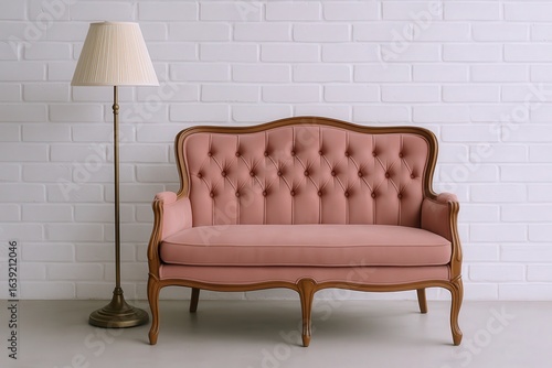 Elegant Tufted Rose Pink Loveseat Paired with a Classic Brass Floor Lamp Against a White Brick Wall