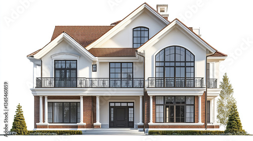 Elegant two story house with large windows and red roof