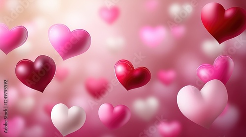 Elegant Valentine's Day background with floating pink and red hearts in soft lighting.