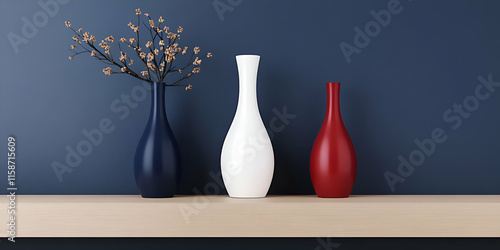 Elegant Vases with Dried Flowers on Shelf, Stylish Home Decor, Modern Minimalist Arrangement, Blue, White, Red Accents, Simple Design, Calm Atmosphere, Sophisticated Style.