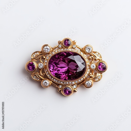 Elegant vintage brooch featuring a large purple gemstone and delicate gold filigree design adorned with sparkling rhinestones