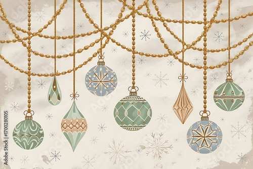 Elegant Vintage Christmas Ornament Decorations Hanging from Twinkling Beaded Strings, Perfect for Festive Holiday Greetings.
