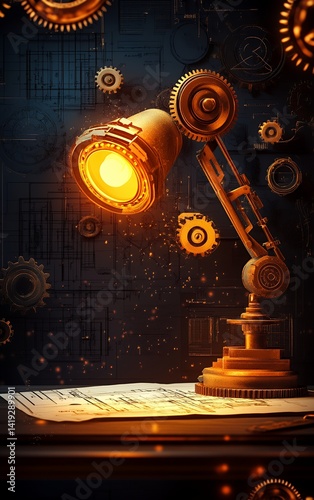 Elegant vintage desk lamp casting warm light creating cozy workspace atmosphere with soft shadows and inviting ambiance enhancing focus and creativity