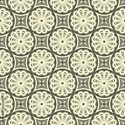 Elegant vintage floral tile pattern featuring retro inspired radial blossoms and geometric accents in muted cream and gray tones. Ideal for textiles, wallpapers, tiles, and seamless background