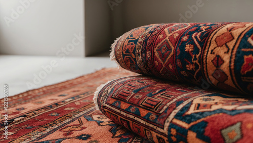 Elegant vintage woven rugs stacked together in a modern, neutral-toned room