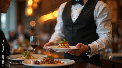 Elegant waiter in black and white uniform serving a gourmet meal to a guest in a luxurious modern restaurant