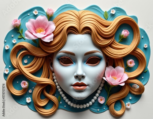 Elegant wall art piece featuring a stunning face adorned with flowers and luxurious hair in a vibrant and artistic design