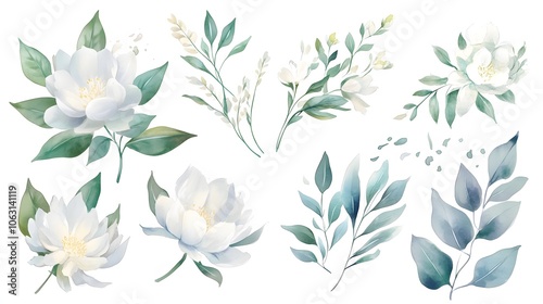 Elegant watercolor collection. This artistic, soft-textured clipart set on a white background offers a natural, muted color palette perfect for botanical designs