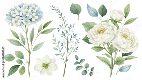 Elegant watercolor floral arrangement with green leaves and soft blue hydrangea, perfect for wedding invitations, greeting cards, and botanical design projects