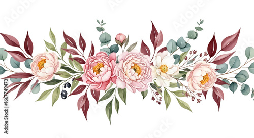 Elegant watercolor floral border featuring peonies, eucalyptus and various leaves creating a delicate and romantic design element for invitations and stationary.