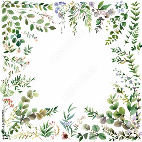 Elegant Watercolor Floral Frame with Green Leaves and Flowers Design