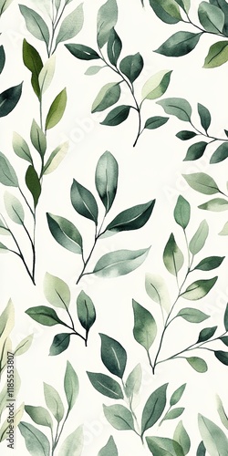 Elegant Watercolor Foliage and Flowers Seamless Pattern in Muted Greens, Soft Browns, and Grey Tones on White Background for Sophisticated Wallpaper and Textile Design
