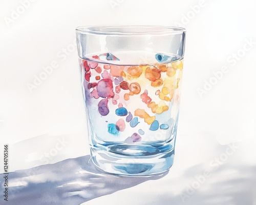 Elegant watercolor of microscopic plastic particles inside a glass of water, transparency revealing invisible threats, soft textures with deep meaning.