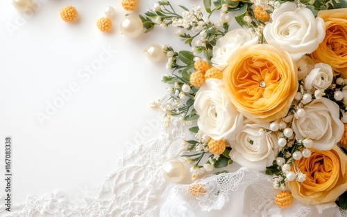 Elegant Wedding Bouquet White Yellow Roses Lace Pearls