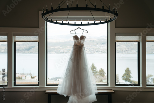 Elegant wedding dress hanging on a chandelier
